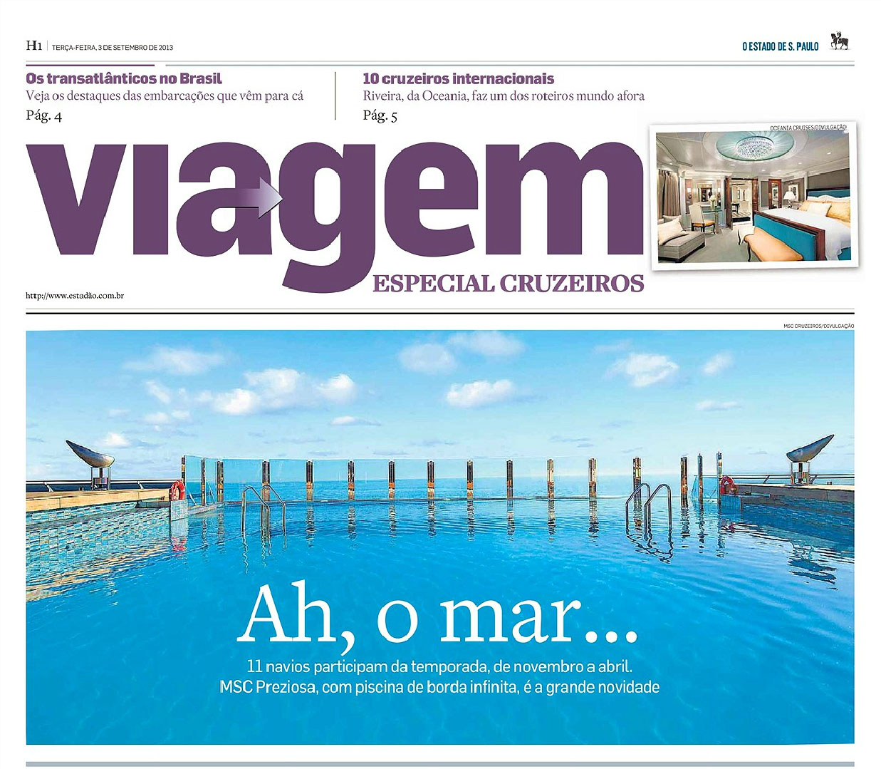 Embarcações. Na temporada, que vai de novembro a abril, a MSC Cruzeiros é a única companhia com navios novos. O destaque é o MSC Preziosa, maior embarcação da temporada. Outra novidade é o MSC Poesia. Completam a lista o MSC Magnifica e o MSC Orchestra. Royal Caribbean e Pullmantur repetem os navios do verão passado. A primeira aposta no Splendour, e a outra, no Empress, no Sovereign e no Zenith.